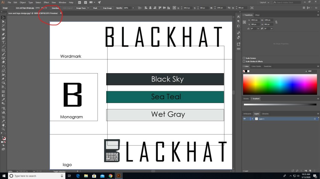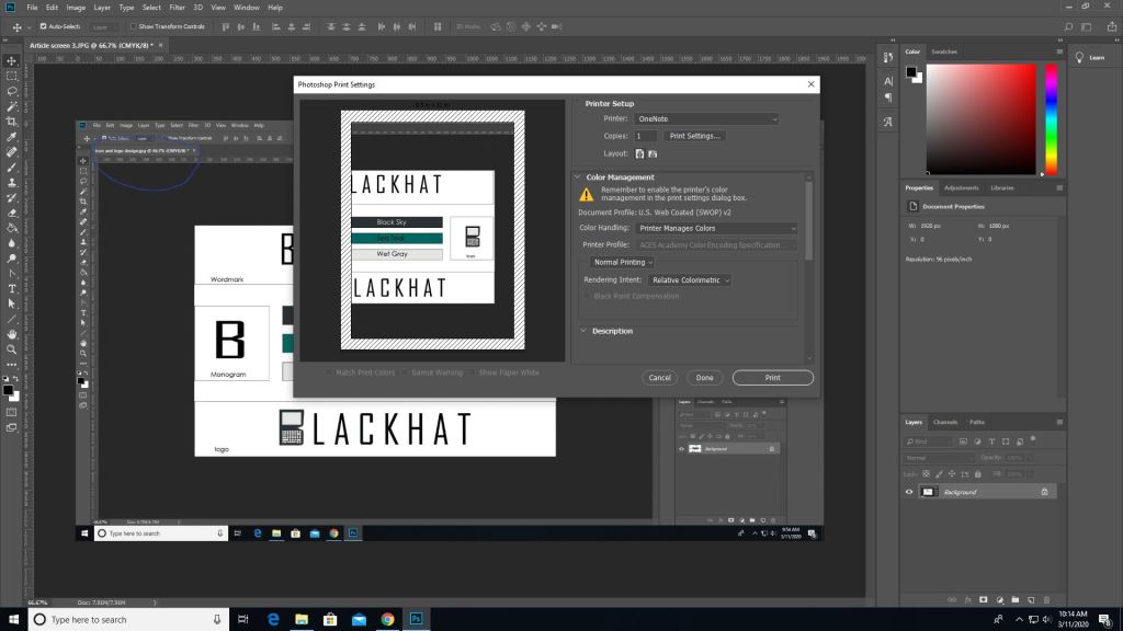 (This picture was made after converting the last image which is why the blue circle looks duller, product of converting) To print go to the file tab-> print, and you’ll see all these options. Where it says document profile it should say web coated (which is basically CMYK). Once you are done setting up hit print.
